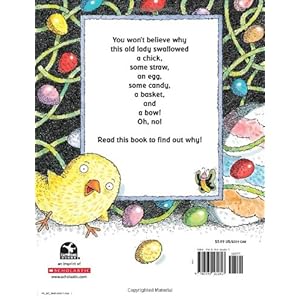This time, the hungry old lady swallows a chick, some straw, an egg, some candy, a basket, and a bow!